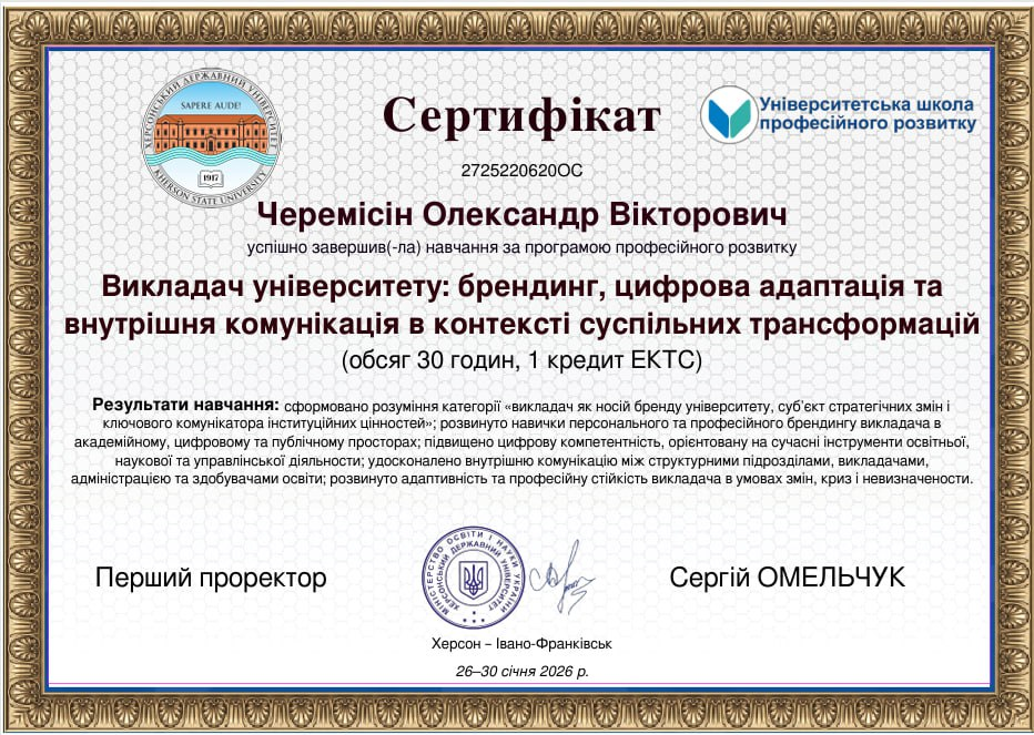 We sincerely thank the organizers of the University School of Professional Development of Kherson State University for the opportunity to join and successfully complete the course "University Teacher: Branding, Digital Adaptation and Internal Communication in the Context of Social Transformations".