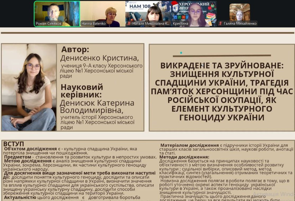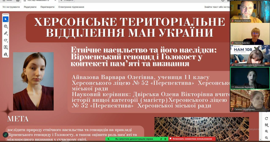 Відбувся постерний захисту учасників І етапу Всеукраїнського конкурсу-захисту науково-дослідницьких робіт учнів – членів Малої академії наук України у 2025-2026 навчальному році. Членами жюрі виступили науковці ХДУ: Кузовова Наталя Миколаївна, Батенко Ганна Вячеславівна та Михайленко Галина Миколаївна. Херсонське міське відділення МАН працювало за секціями: археологія, краєзнавство, Історія України та всесвітня історія. Бажаємо учасникам подальших перемог!