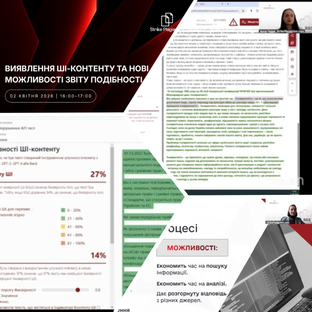 Фахівці наукової бібліотеки ХДУ долучились до вебінару «Виявлення ШІ-контенту та нові можливості Звіту подібності», організованого компанією StrikePlagiarism.com.