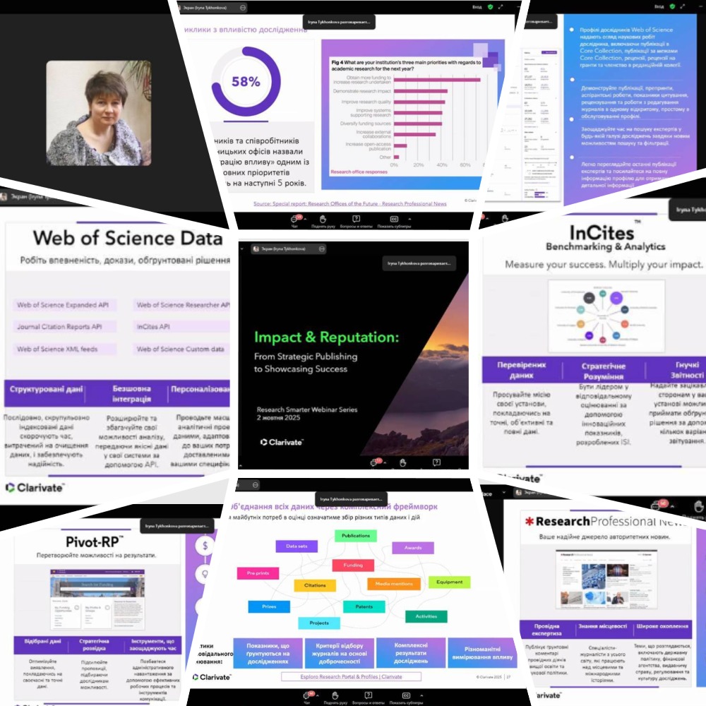 2 жовтня 2025 року співробітники Наукової бібліотеки ХДУ долучилися до безкоштовного вебінару від компанії Clarivate «Авторитет і репутація організації: від публікаційної стратегії до демонстрації досягнень». Спікером виступила: Ірина ТИХОНКОВА.