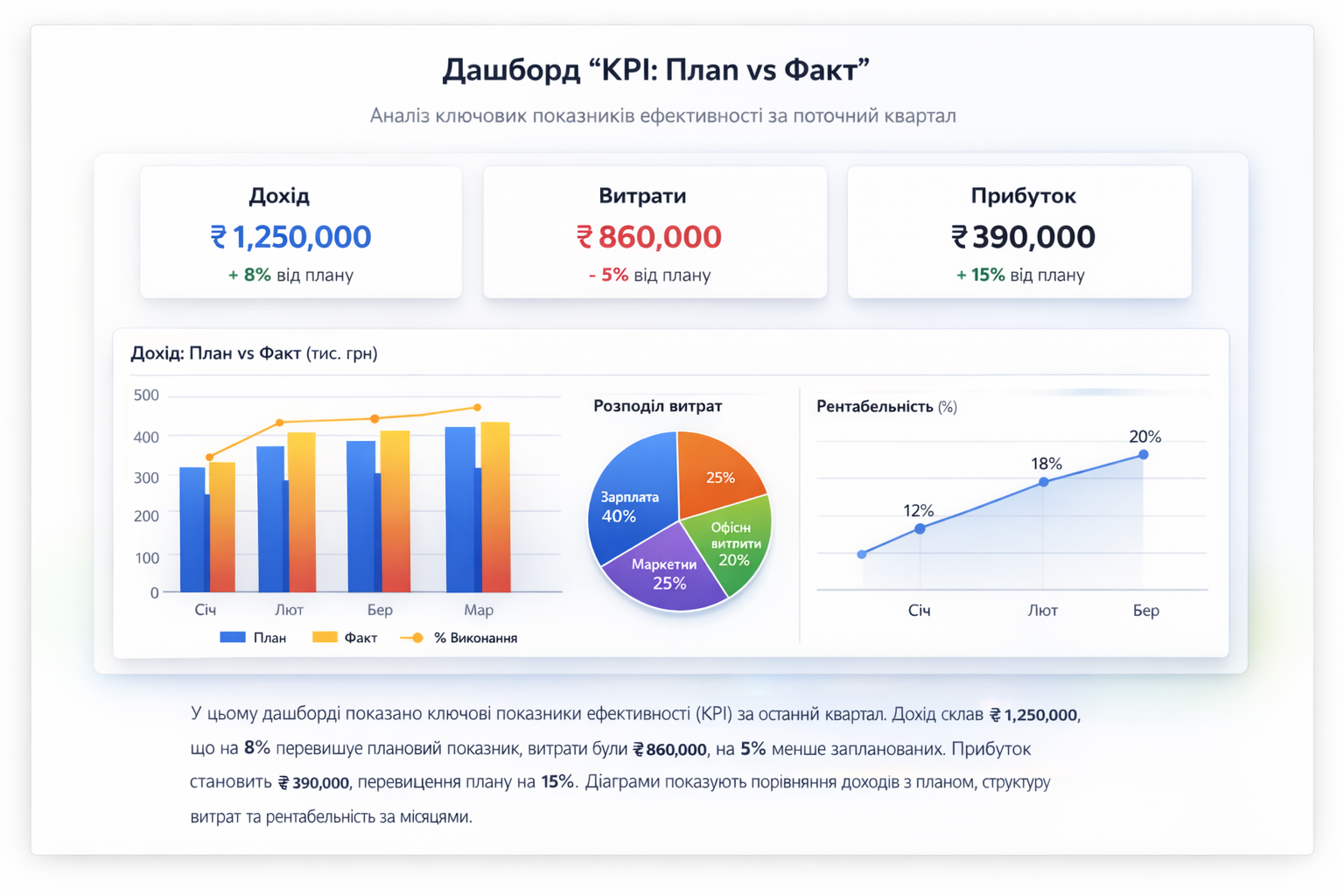 - Фінансовий аналіз і планування: план/факт, cash-flow, KPI, управлінська звітність.
