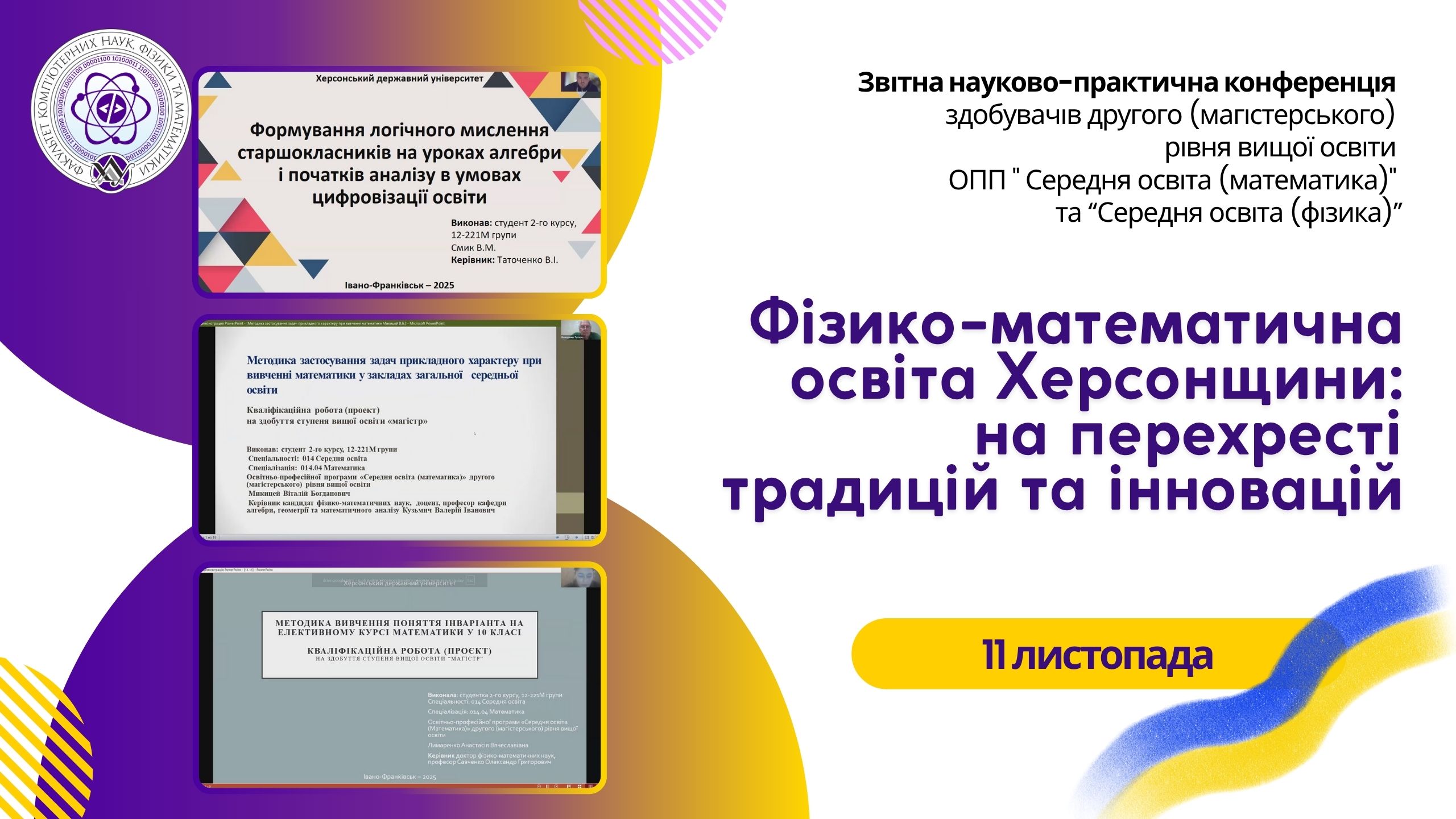 11 листопада 2025 року на факультеті комп'ютерних наук, фізики та математики відбулася Звітна науково-практична конференція здобувачів другого (магістерського) рівня вищої освіти за освітньо-професійними програмами «Середня освіта (математика)» та «Середня освіта (фізика)» в рамках заходів до святкування 108-ї річниці від заснування Херсонського державного університету.