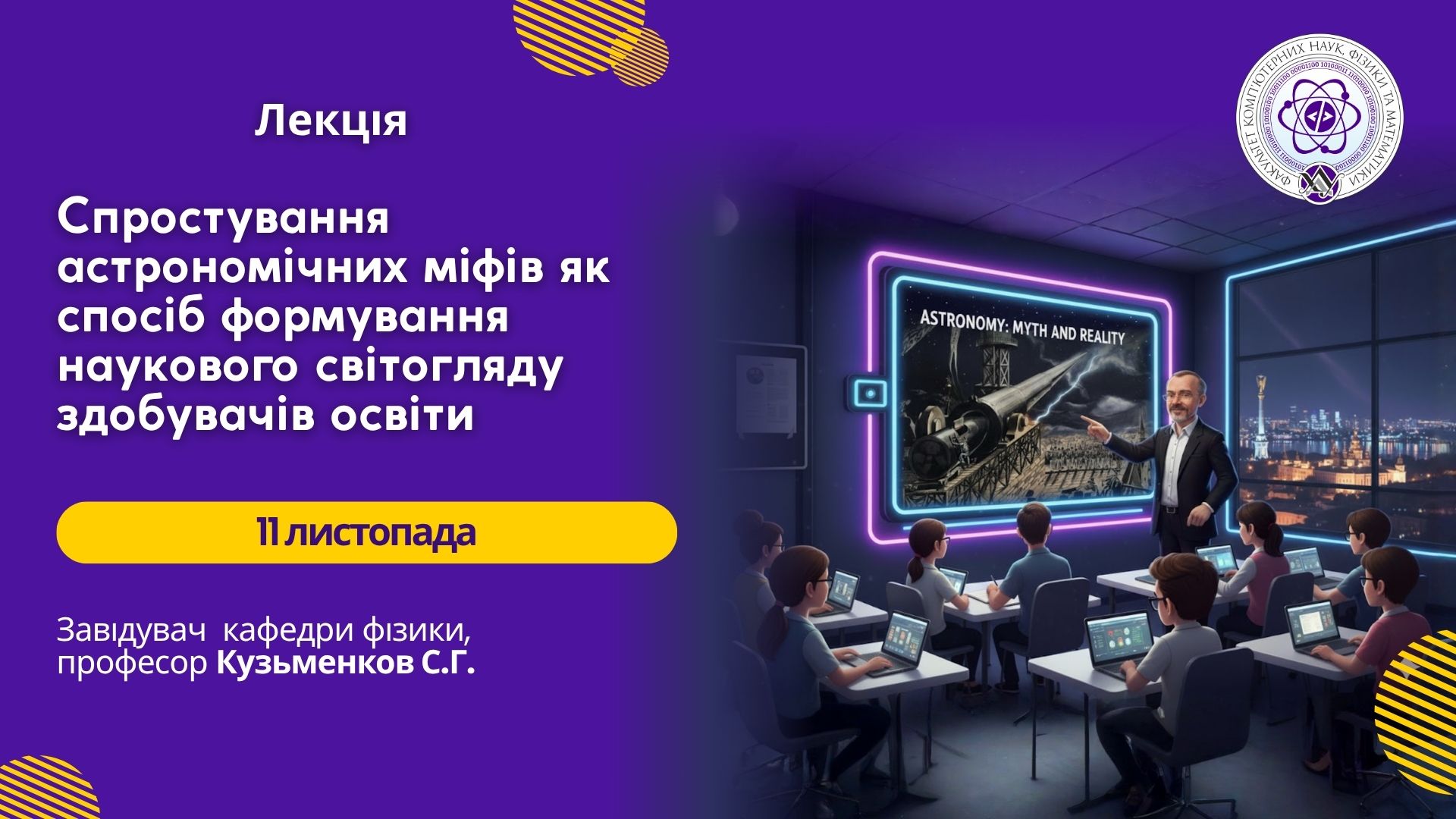 Сьогодні, 11 листопада 2025 р. на факультеті комп'ютерних наук, фізики та математики відбулася надзвичайно цікава та змістовна лекція з теми "Спростування астрономічних міфів як спосіб формування наукового світогляду здобувачів освіти".
