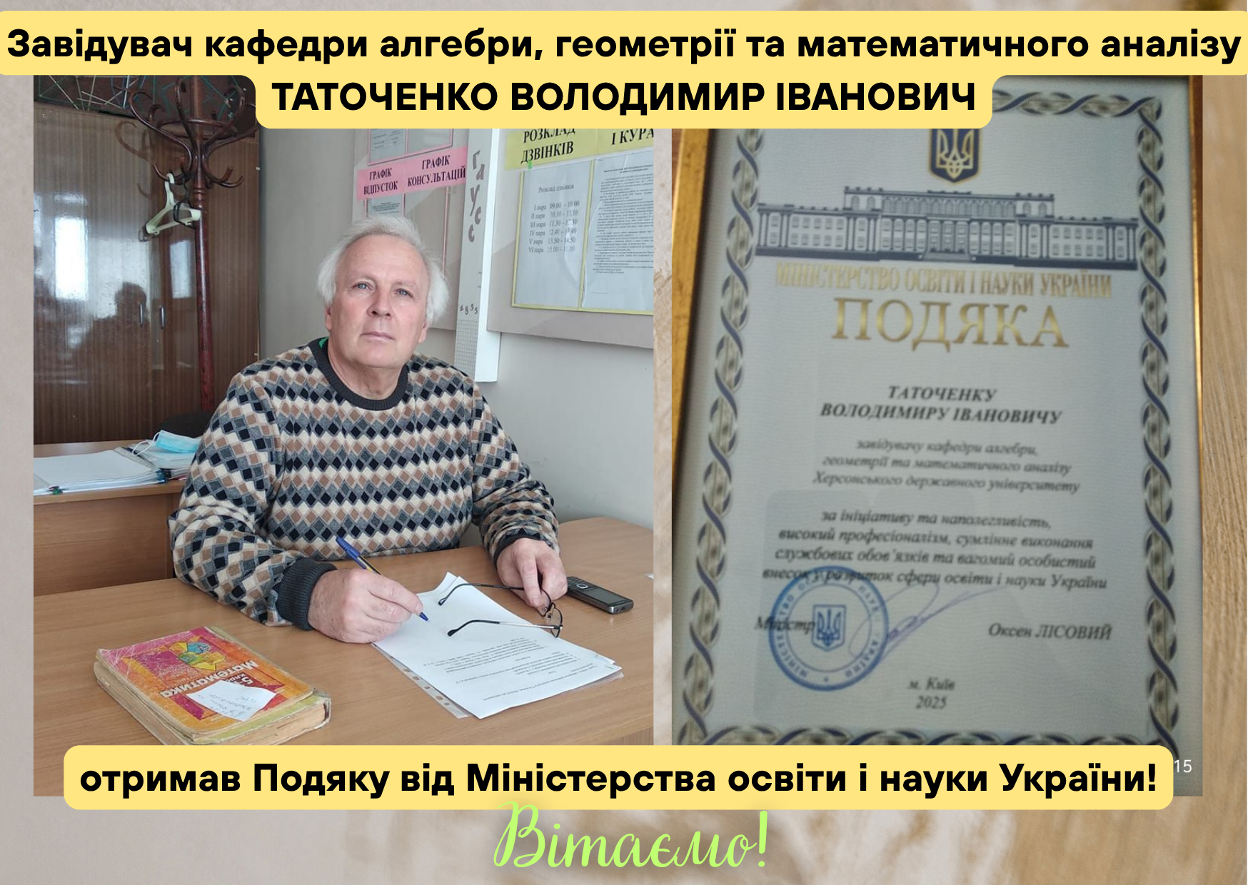 Завідувач кафедри алгебри, геометрії та математичного аналізу Херсонського державного університету, Володимир Іванович Таточенко отримав Подяку від Міністерства освіти і науки України за: