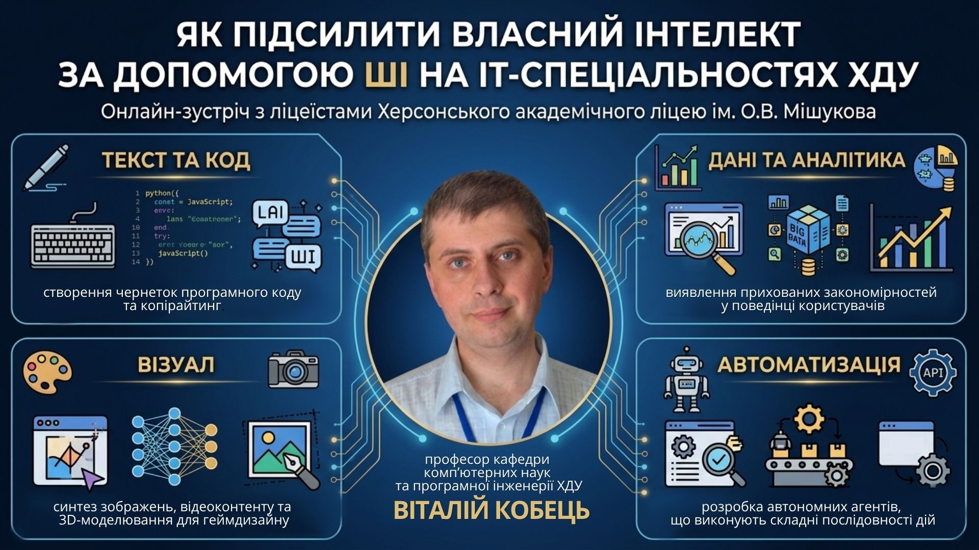 03 квітня 2026 року відбулася зустріч професора кафедри комп'ютерних наук та програмної інженерії Віталія Кобця з учнями Херсонського фізико-технічного ліцею. Головною темою обговорення став вплив штучного інтелекту на сучасну освіту, трансформацію IT-ринку та етичні виклики, які постають перед майбутніми фахівцями.