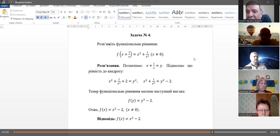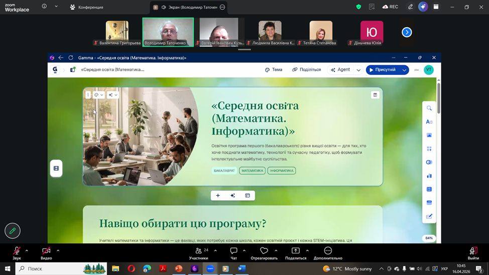 On April 16, faculty members of the Department of Algebra, Geometry, and Mathematical Analysis held an online event for graduating students of the Komyshany General Secondary School of I-III Degrees No. 26 (Kherson City Council). The meeting focused on the presentation of the "Secondary Education (Mathematics and Computer Science)" educational program. This event served as a platform to discuss the advantages of studying at Kherson State University (KSU) and the professional prospects of becoming a teacher of mathematics and informatics.