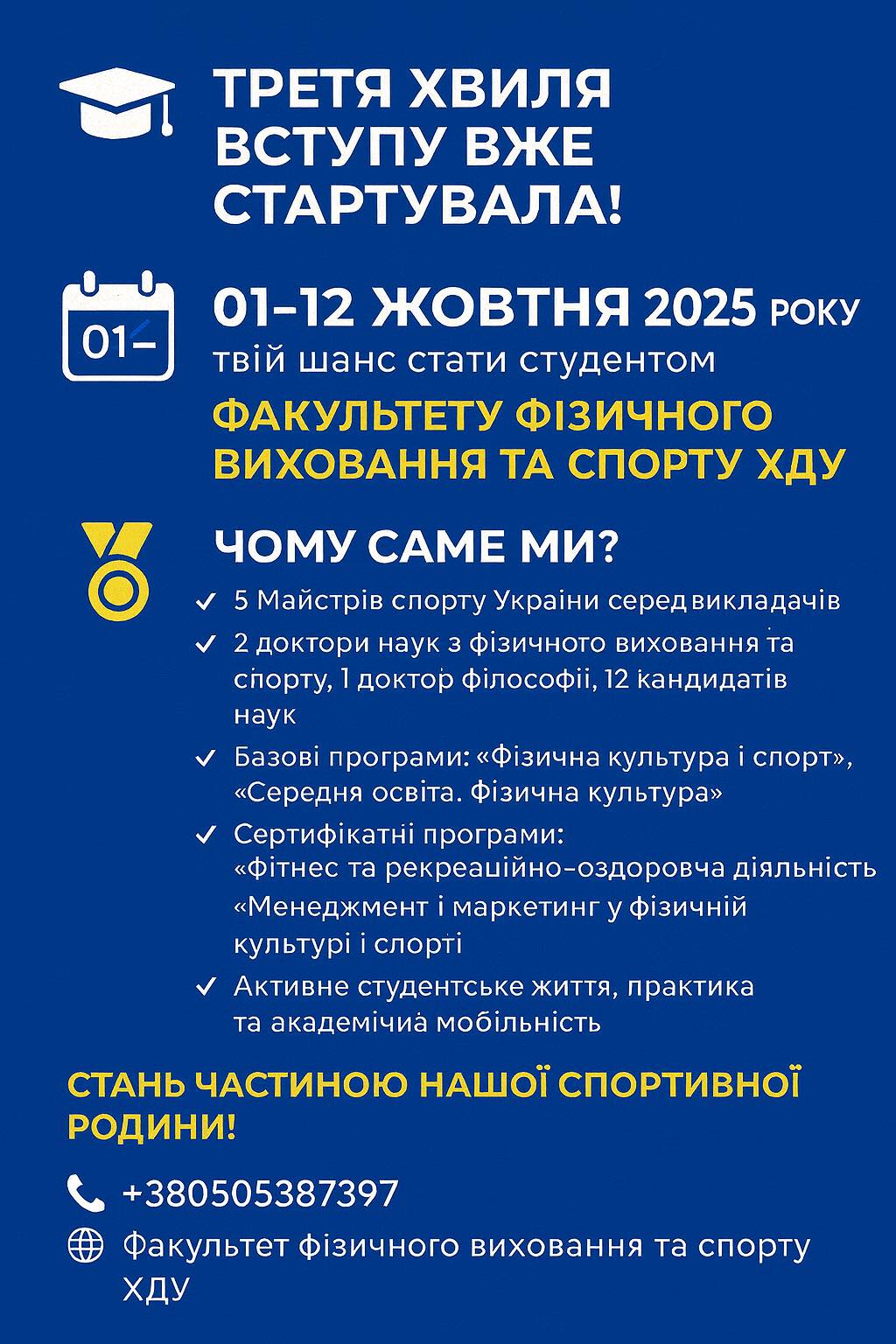 01–12 жовтня 2025 року – твій шанс стати студентом Факультету фізичного виховання та спорту ХДУ!