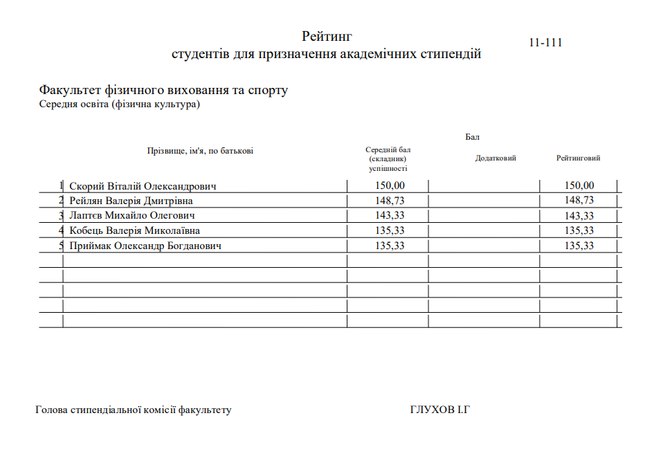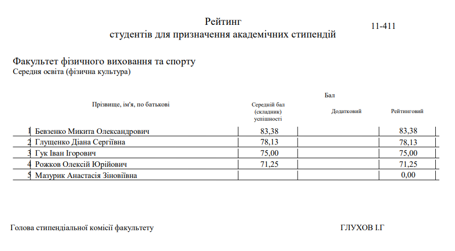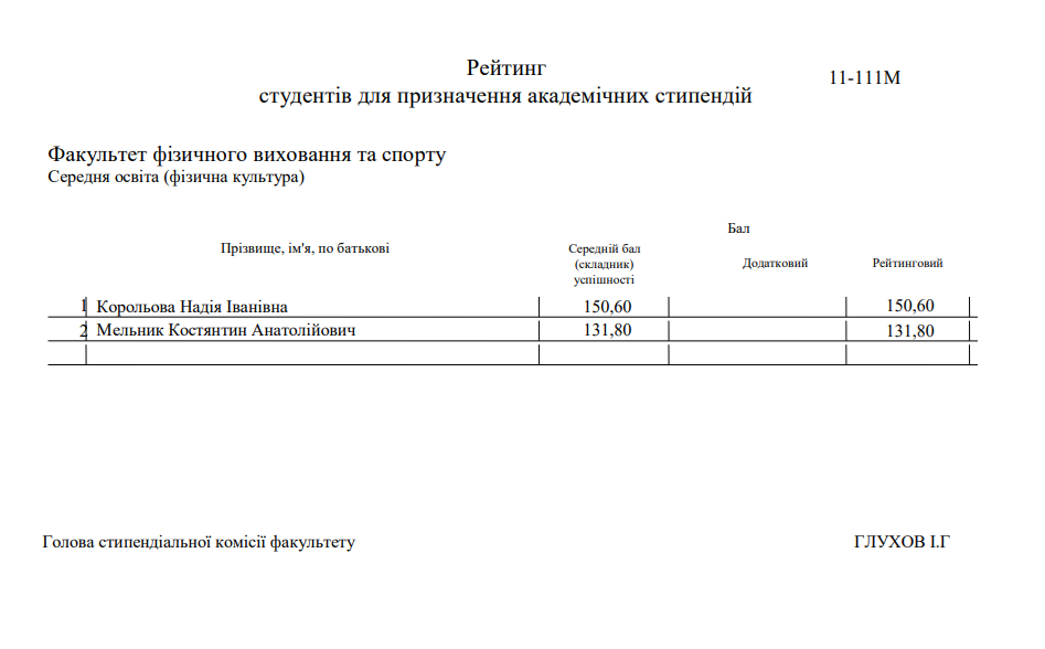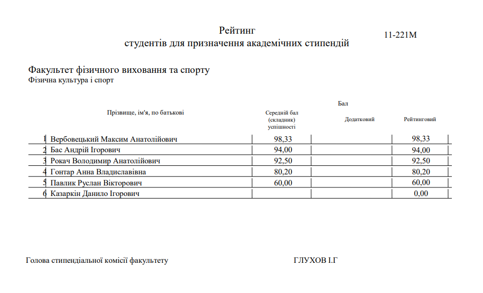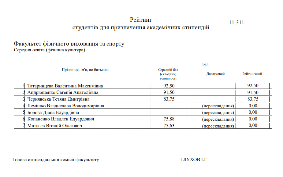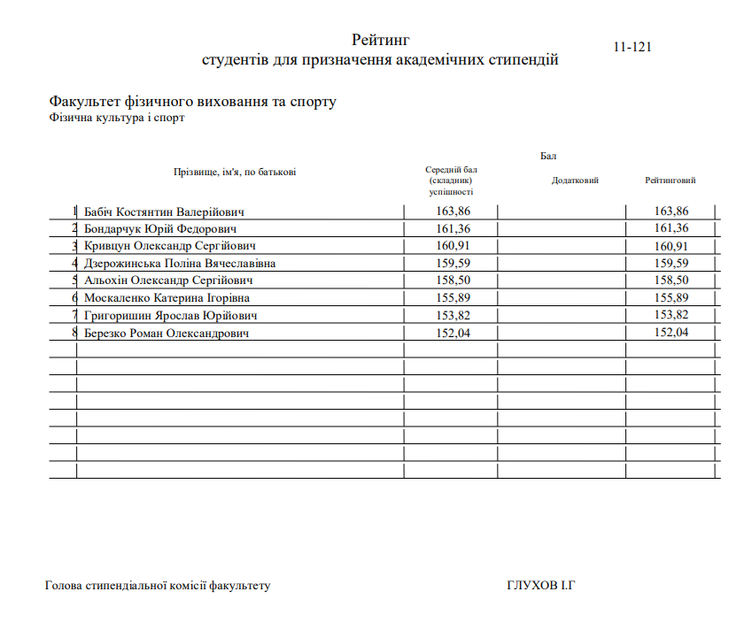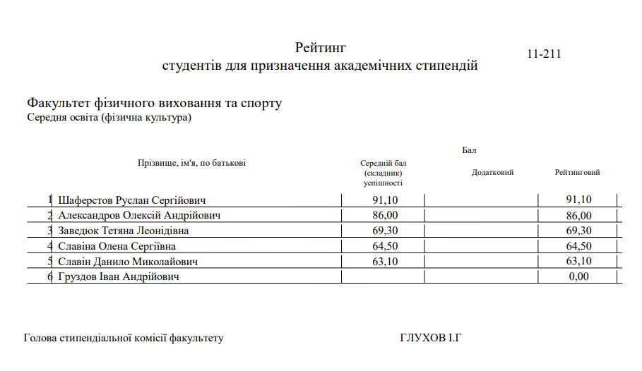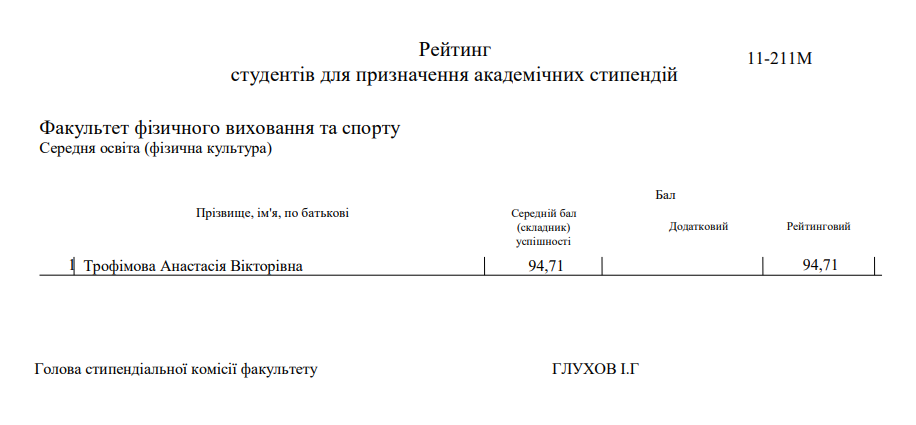 Рейтинг студентів факультету фізичного виховання та спорту для призначення академічних стипендій на 1 семестр 2025/2026 н.р.