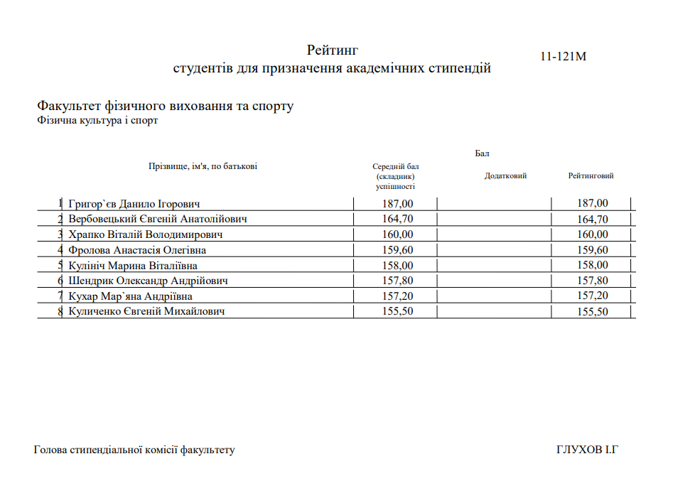 Рейтинг студентів для призначення академічних стипендій по факультету фізичного виховання та спорту за підсумками складання літньої заліково-екзаменаційної сесії на І семестр 2020-2021 навчального року