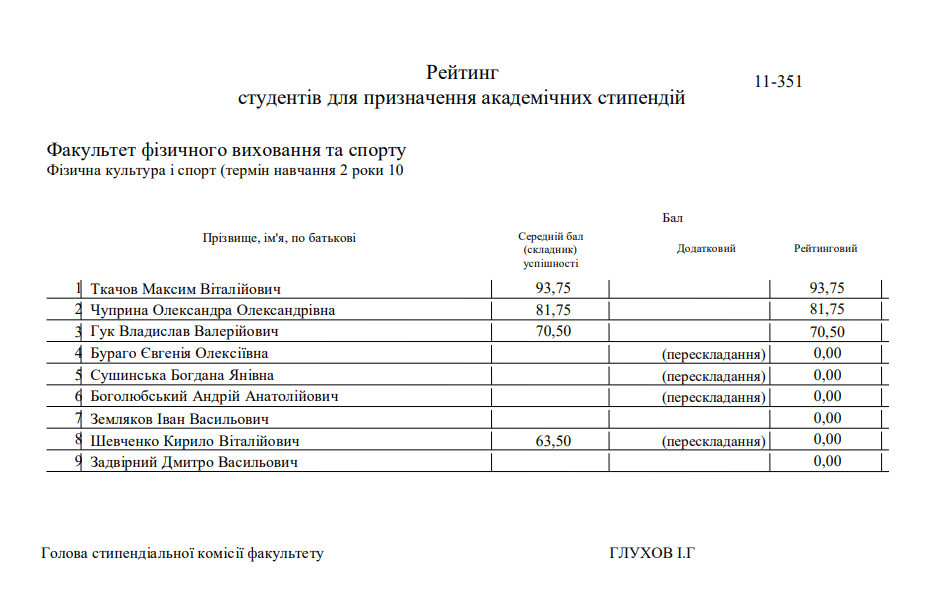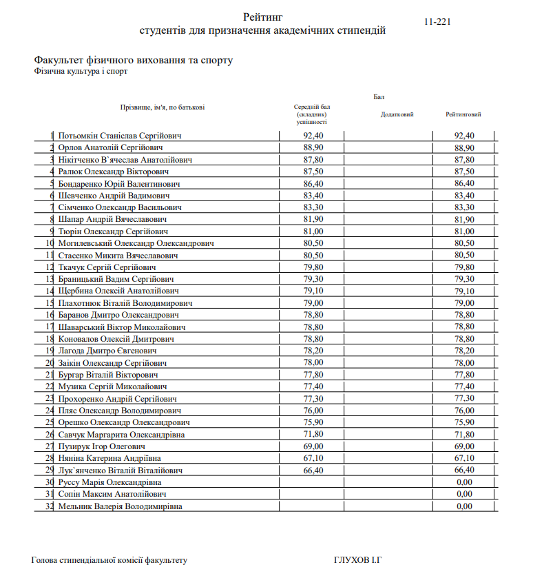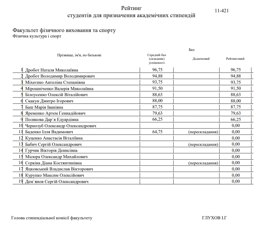 Рейтинг студентів факультету фізичного виховання та спорту для призначення академічних стипендій за результатами складання літньої заліково-екзаменаційної сесії на IІ семестр 2022-2023 н.р.