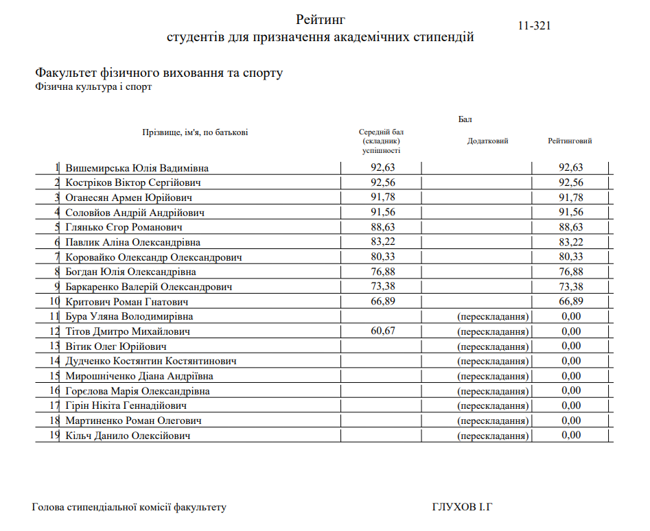 Рейтинг студентів факультету фізичного виховання та спорту для призначення академічних стипендій за результатами складання зимової екзаменаційно-залікової сесії на І семестр 2022-2023 н.р.