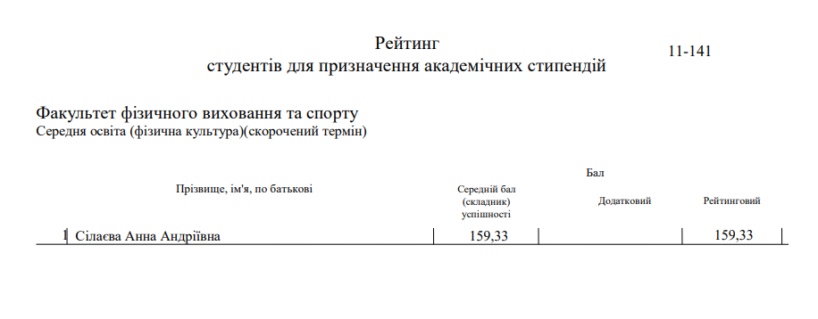 Рейтинг студентів факультету фізичного виховання та спорту для призначення академічних стипендій на 1 семестр 2024/2025 н.р.