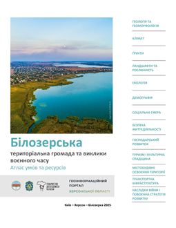 Білозерська територіальна громада та виклики воєнного часу. Атлас умов та ресурсів» Заг. ред. П. Остапенко, Д. Мальчикової; авт. кол.: П. Остапенко, Д. Мальчикова, І. Пилипенко та ін.