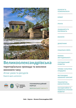 «Великоолександрівська територіальна громада та виклики воєнного часу. Атлас умов та ресурсів» Заг. ред. П. Остапенко, Д. Мальчикової; авт. кол.: П. Остапенко, Д. Мальчикова, І. Пилипенко та ін. (видання друге, доповнене).