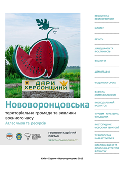 «Нововоронцовська територіальна громада та виклики воєнного часу. Атлас умов та ресурсів» Заг. ред. П. Остапенко, Д. Мальчикової; авт. кол.: П. Остапенко, Д. Мальчикова, І. Пилипенко та ін.
