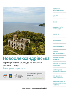 «Новоолександрівська територіальна громада та виклики воєнного часу. Атлас умов та ресурсів» Заг. ред. П. Остапенко, Д. Мальчикової; авт. кол.: П. Остапенко, Д. Мальчикова, І. Пилипенко та ін.