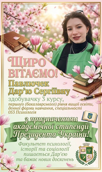 Щиро вітаємо здобувачку 3 курсу ОП Психологія Дар'ю Павлючек з призначенням академічної стипендії Президента України!