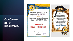 Голова студентської ради факультету Євсюков Ростислав оголосив прізвища студентів та додаткові бали, які здобувачі отримують на прикінці семестру та окремо відмітив та подякував групі 07-131 та її старості Смєліковій Аріні за активну участь у факультетських заходах.