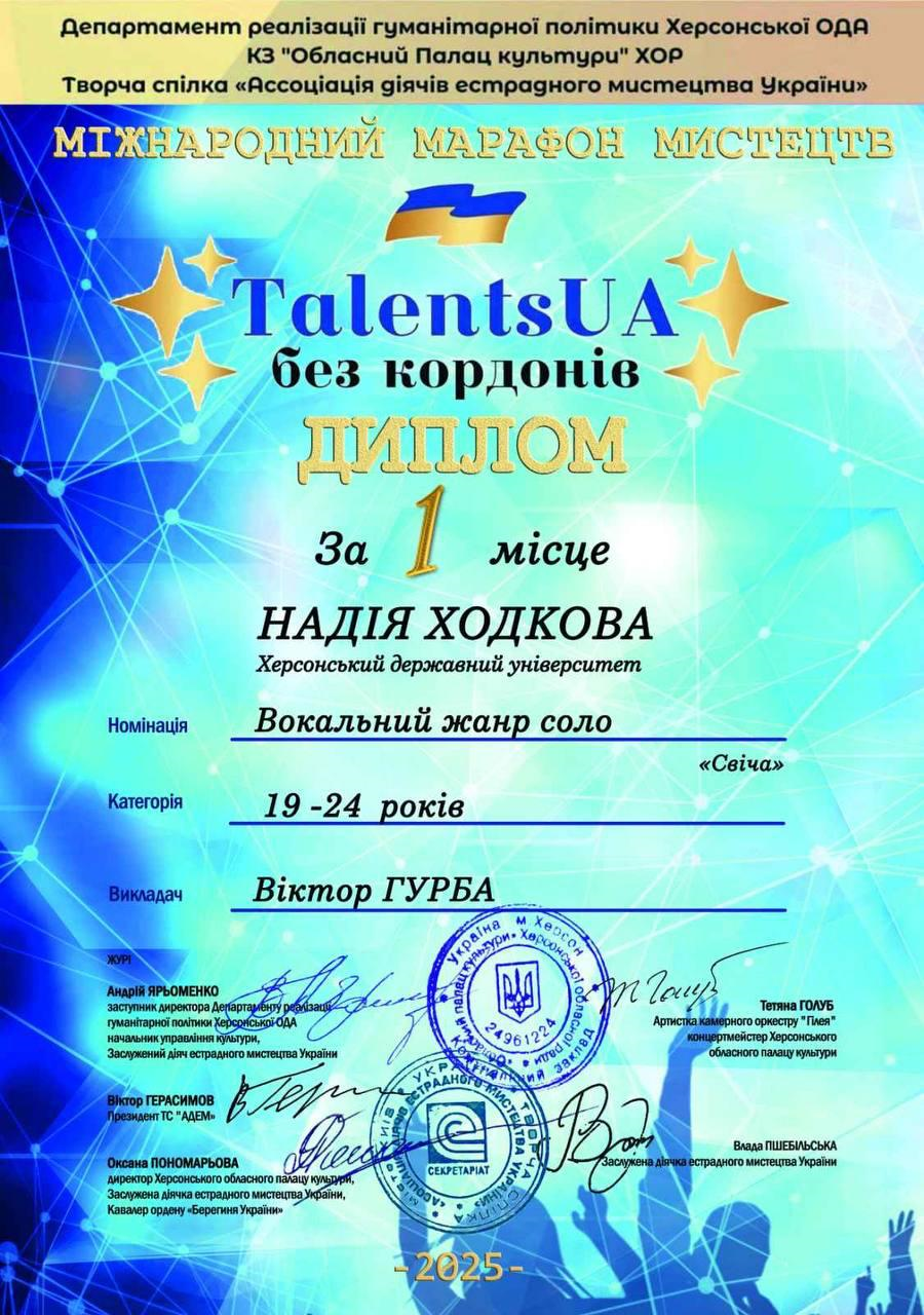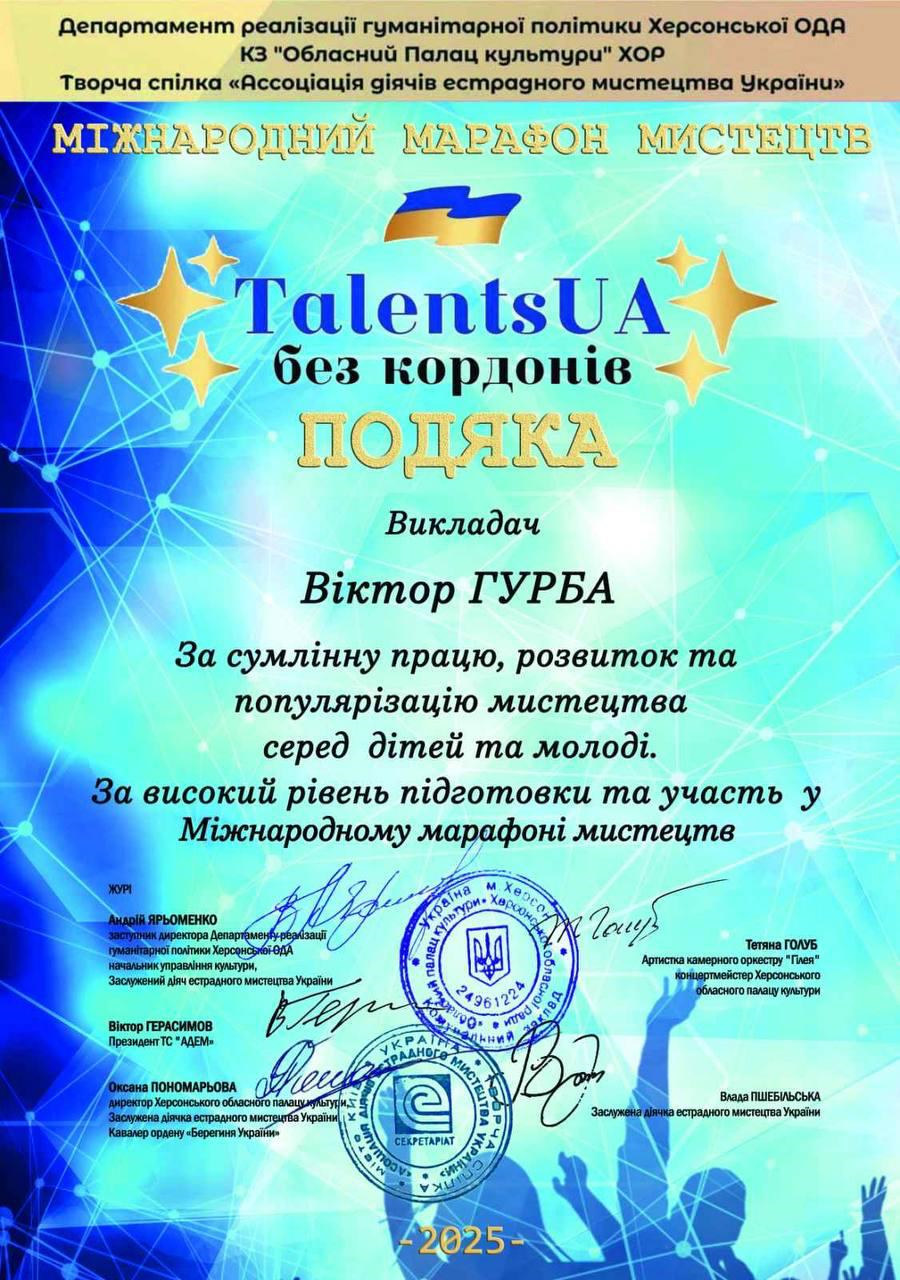 Протягом листопада 2025 року відбувся Міжнародний марафон мистецтв “TalentsUA БЕЗ КОРДОНІВ”* — масштабний онлайн-проєкт, покликаний популяризувати українську культуру в усьому світі та об’єднати талановитих українців незалежно від країни проживання.