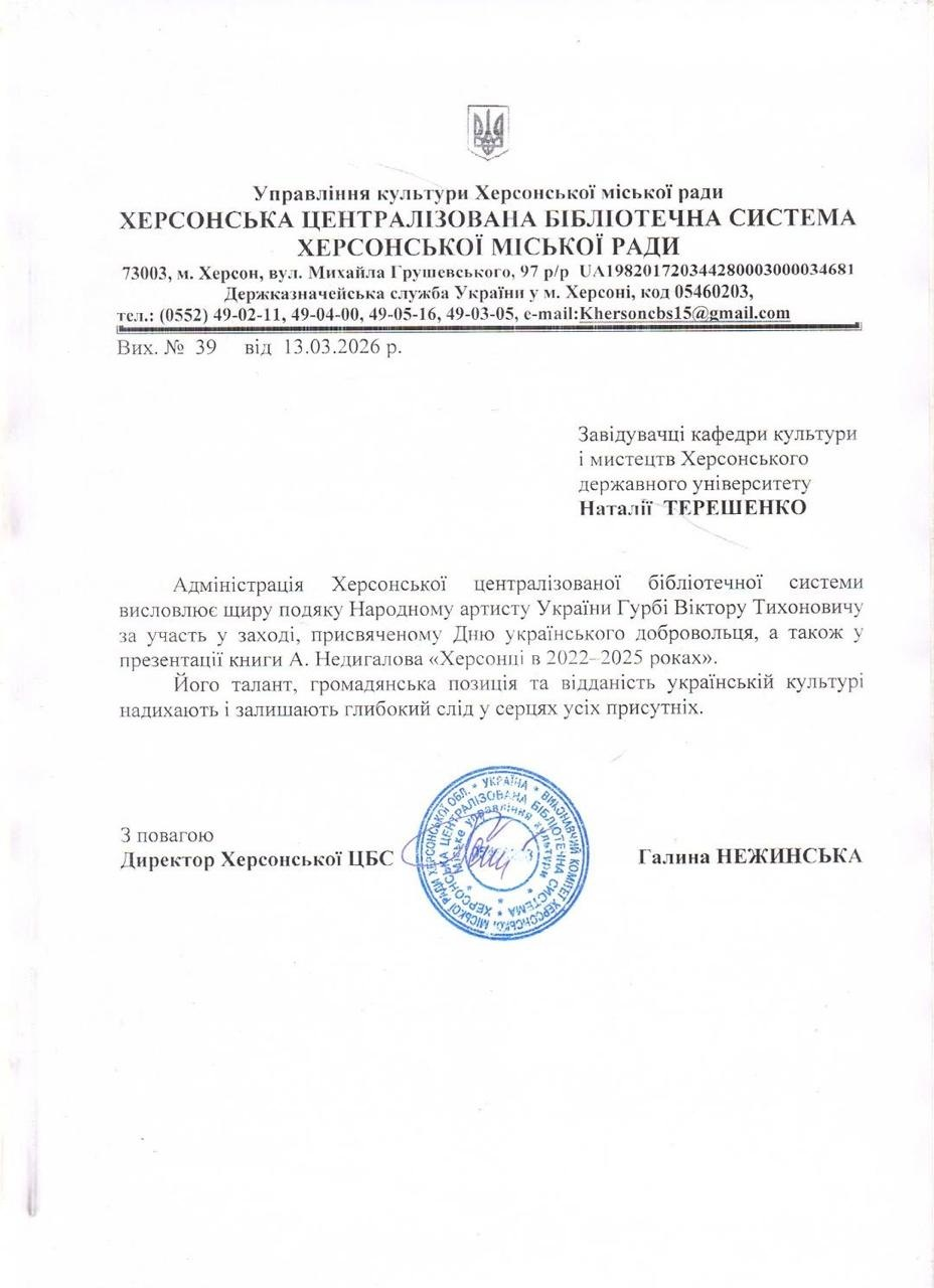 Щира вдячність Наталії Федотовій, директорці Херсонського фахового коледжу культури і мистецтв за співпрацю та допомогу в організації зустрічі