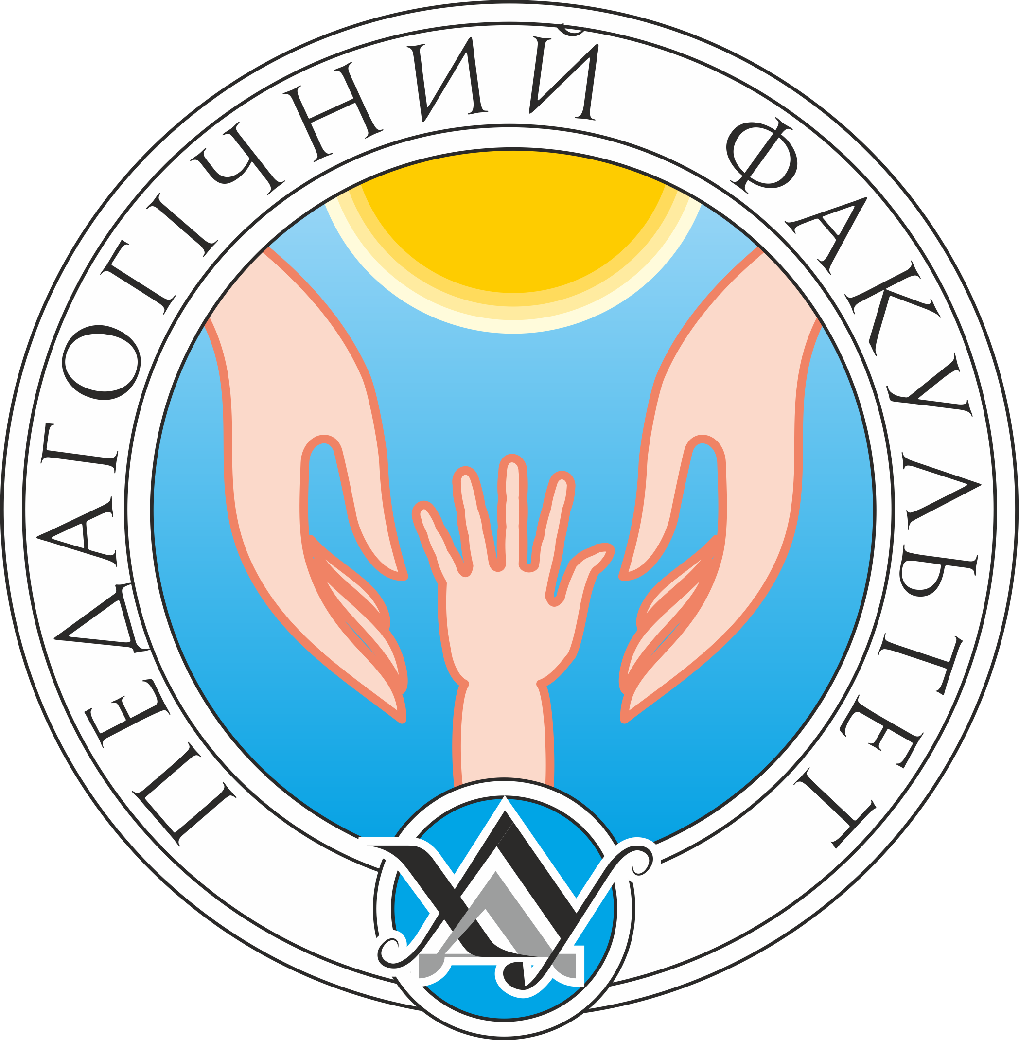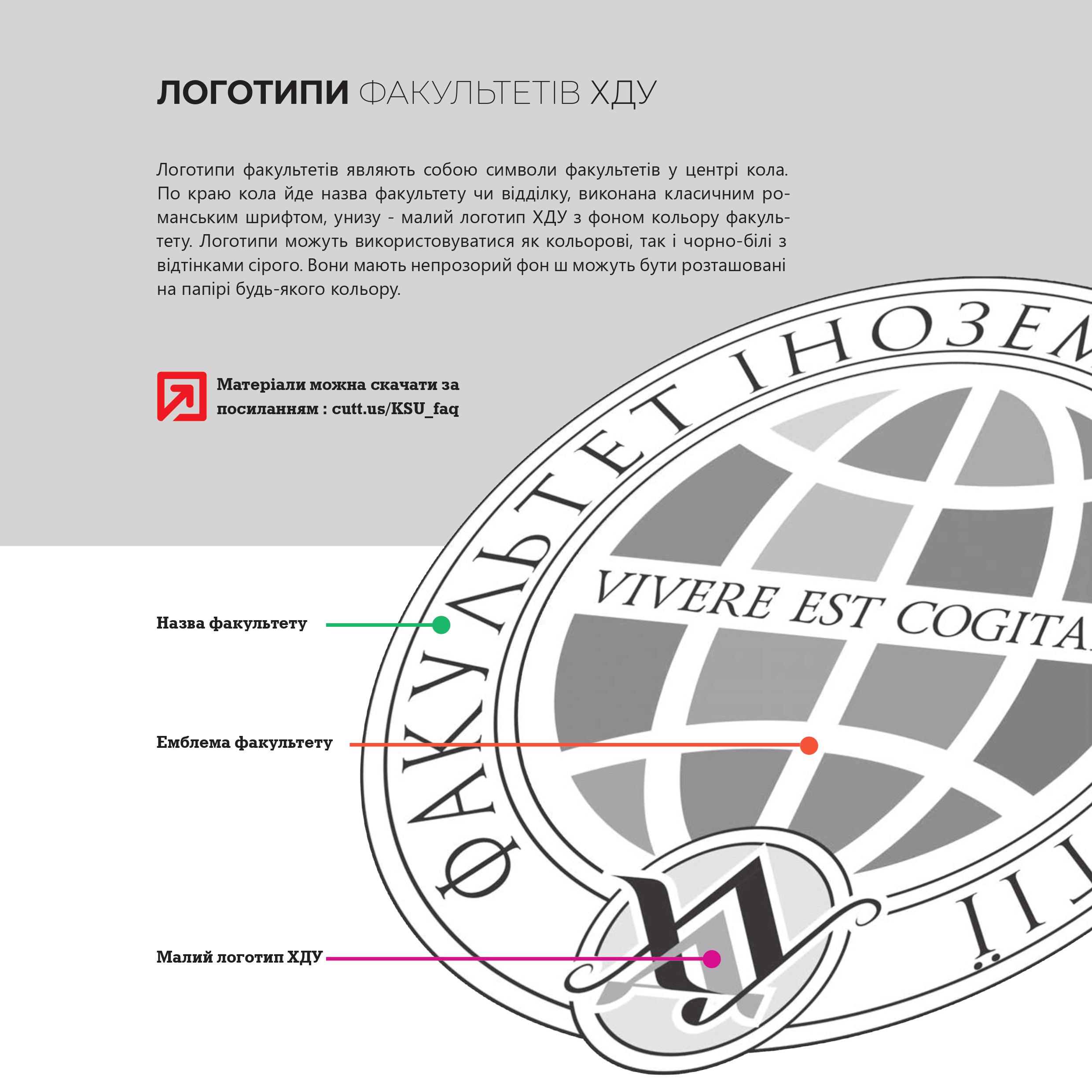 де простак (наївна персона) чекає допоки що й Головний. Вони складаються з 3х частин: у середині – символи факультету, навкруги – кільце з назвою факультету, виконане у тому ж стилі, що й кільце Головного логотипу, і унизу посередині кільця – один з варіантів «малого» лого з абревіатурою «ХДУ». У лого кожного факультета використовано фірмовий колір факультета, який також можна застосувати для рекламної продукції, пов’язаної з факультетом.