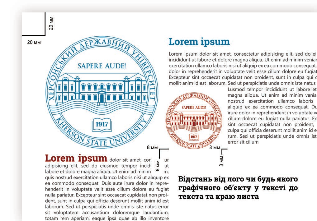 Рекомендована мінімальна відстань для логотипу - від зовнішнього краю, верху та низу аркушу від 20 мм, від тексту - від 3 мм до 8 мм у залежності від розмірів логотипу. Відстань від тексту, що знаходиться нижче за Лого, рекомендуємо робити не менш ніж 8 мм. Якщо Лого вписане у полі
