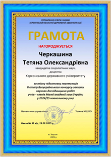 За якісну підготовку переможниці ІІ етапу Всеукраїнського конкурсу-захисту науково-дослідницьких робіт учнів-членів Малої академії наук в секції "Соціологія", доцентку кафедри Черкашину Т.О. нагороджено грамотою Управління освіти і науки Херсонської обласної державної адміністрації. Черкашина Т.О. підготувала ученицю 10 класу Херсонського наукового ліцею Херсонської обласної ради Фертак Ксенію до участі у Всеукраїнському конкурсі, на якому посіли 1 місце на ІІ етапі та 3 місце на ІІІ етапі захисту науково-дослідницьких робіт. Вітаємо переможців та бажаємо подальших успіхів в науково-дослідній діяльності.