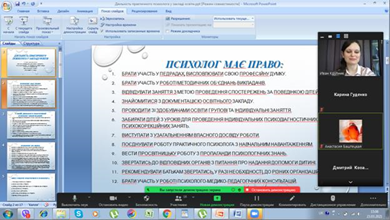 On March 23, 2021, in accordance with the postgraduate internship program, Anna Anatoliyivna Krupnyk, a graduate student of the 3rd year of study specialty 053 Psychology, gave a lecture for first (bachelor) level 231 group on "Activities of a practical psychologist in the institution education ".
