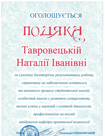 Congratulations to the supervisor - Candidate of Psychological Sciences, Associate Professor, Associate Professor of Psychology Natalia Ivanovna Tavrovetska!