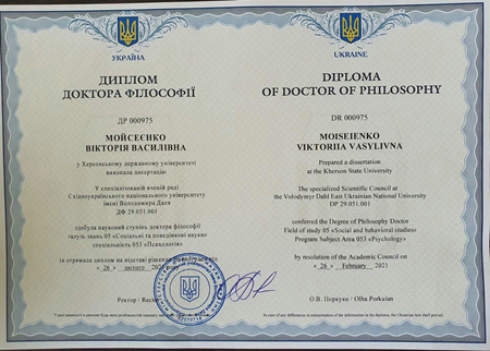 We sincerely congratulate the teacher of the Department of Psychology Moiseenko Victoria Vasilyevna on receiving the degree of Doctor of Philosophy in the field of knowledge 05 Social and behavioral sciences specialty 053 Psychology !!!