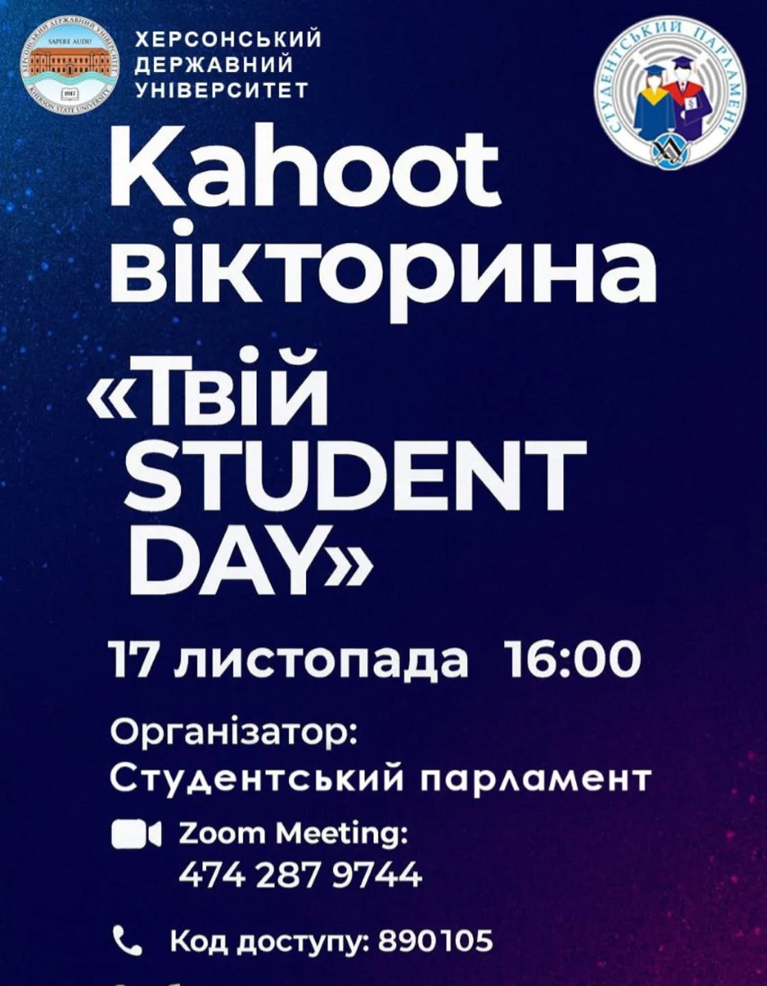 Запрошуємо всіх студентів ХДУ поринути в атмосферу драйву та змагального духу на Kahoot-викторині «Твій STUDENT DAY»!