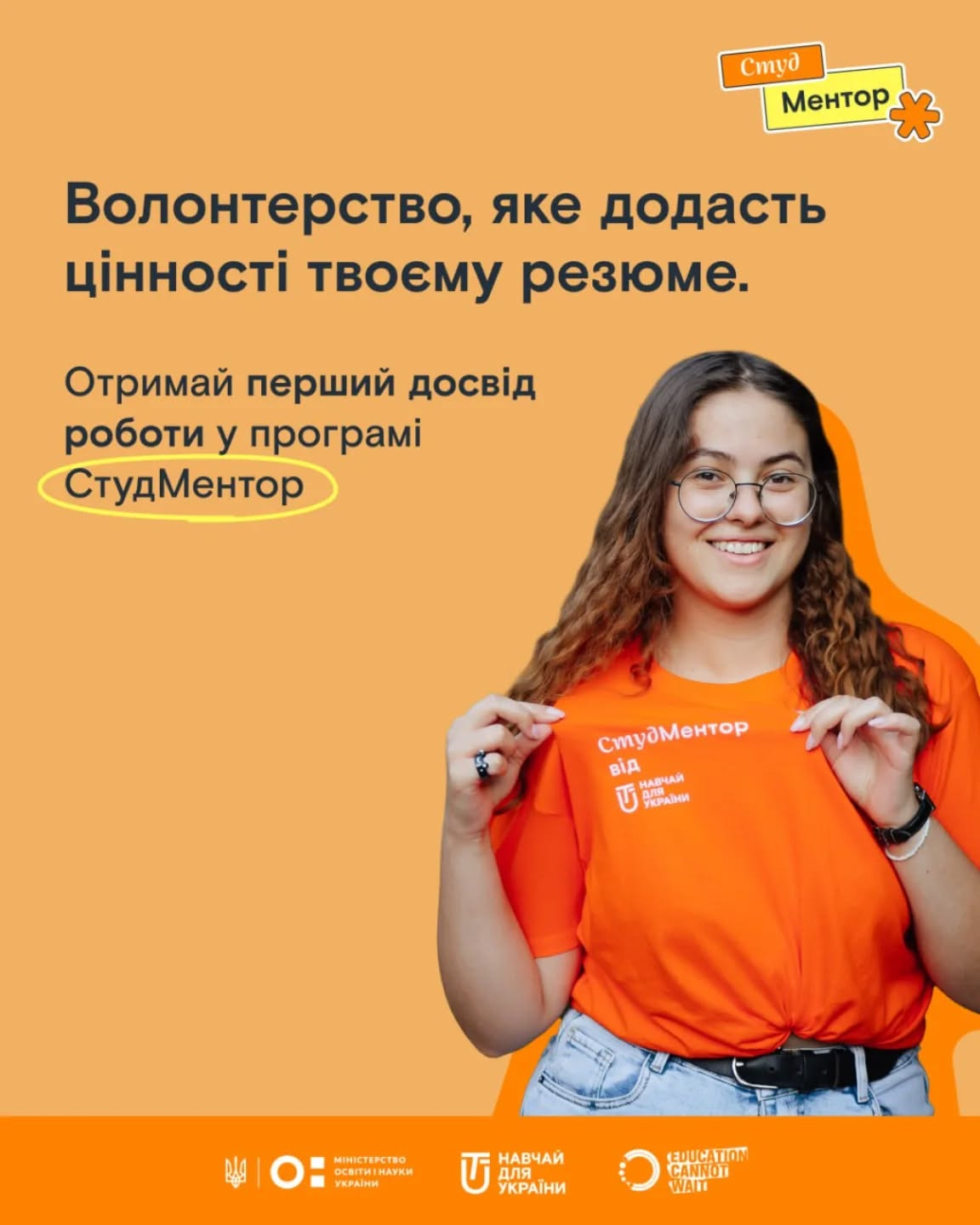 Наші партнери ГО «Навчай для України» запрошують вас стати частиною інтелектуального волонтерства в програмі «СтудМентор» та підтримати школярів із прифронтових регіонів у навчанні та розвитку.