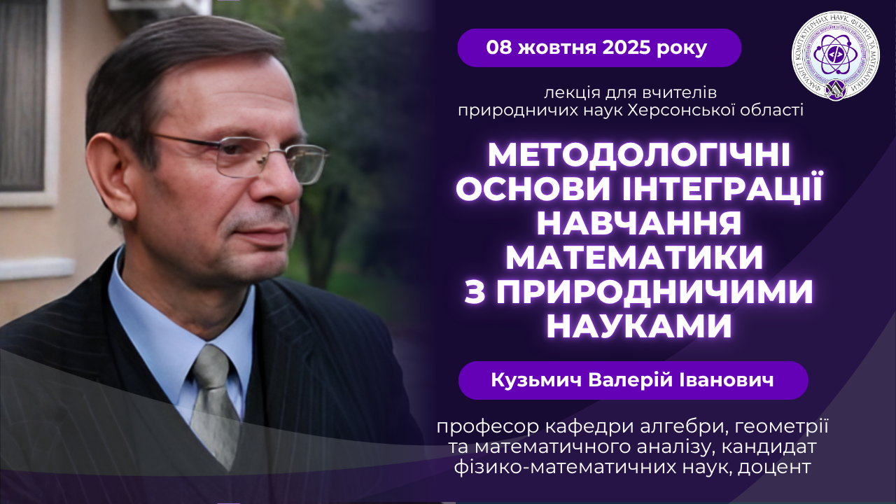 08 жовтня 2025 року професор кафедри алгебри, геометрії та математичного аналізу, кандидат фізико-математичних наук, доцент Кузьмич Валерій Іванович прочитав вчителям природничих наук Херсонської області лекцію з теми: «Методологічні основи інтеграції навчання математики з природничими науками».