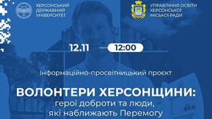 12 листопада у Херсонському державному університеті відбулася презентація соціально-просвітницького проєкту «Волонтери Херсонщини: герої доброти та люди, які наближають Перемогу». Цей проєкт реалізовувався факультетом психології, історії та соціології ХДУ спільно з управлінням освіти Херсонської міськради.