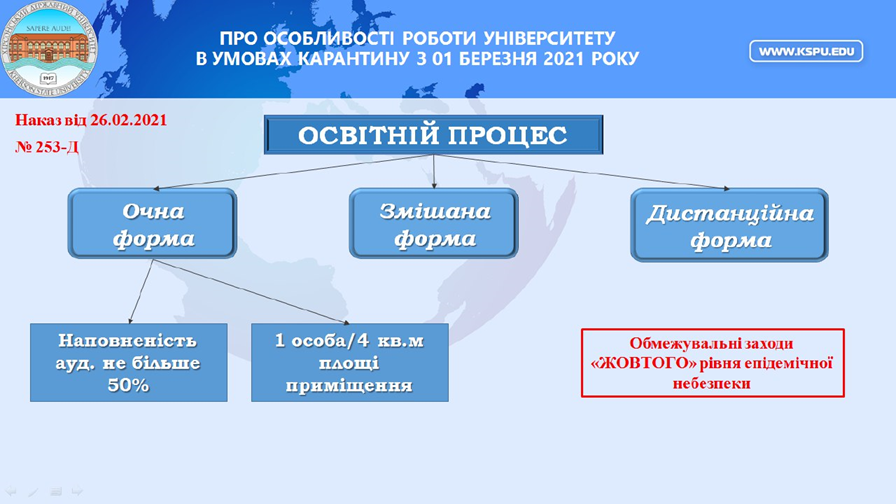 Перший проректор Сергій Омельчук ознайомив присутніх з особливостями роботи ХДУ в умовах «жовтого» рівня епідемічної небезпеки з 1 березня. За словами проректора, Херсонський державний університет частково повертається до очної форми навчання. Важливо, що наповненість аудиторій має становити не більше 50%, 1 особа / 4 кв.м площі приміщення. Цей процес регулюють декани факультетів.