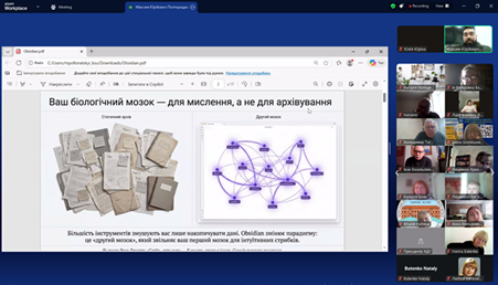 Під час зустрічі учасники ознайомилися з можливостями застосунку Obsidian — безкоштовного інструменту для роботи з нотатками, науковими напрацюваннями, статтями, проєктами та проєктними заявками. Спікер продемонстрував, як за допомогою Obsidian можна створити зручний інтерфейс для структурування інформації, архівування матеріалів і полегшення процесу написання наукових текстів та проєктів.