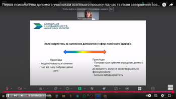 organized by the Ministry of Education and Science of Ukraine, the State Scientific Institution "Institute for Modernization of Educational Content", the Ukrainian Institute for the Development of Education, the Association for Innovative and Digital Education with the participation of leading international experts in psychology - head of the psychological service of Ariel University (Israel) Olga Bass-Linchuk and consultant in mental health and psychosocial support, trainer of the international short-session program SETA (Johns Hopkins Institute, a leading US educational institution in the field of clinical psychology), expert of the program "Suicide Prevention in Communities" (a project in cooperation with the Government of Norway) Yulia Zagarnytska.