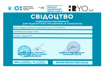 On August 14, 2025, Candidate of Pedagogical Sciences, Associate Professor of the Department of Philosophy, Sociology and Social Work Shvets T.M. participated in the practical training "Psychological First Aid During and After War" as part of the advanced training course for educators "Psychological First Aid for Participants in the Educational Process During and After the End of Military Operations",