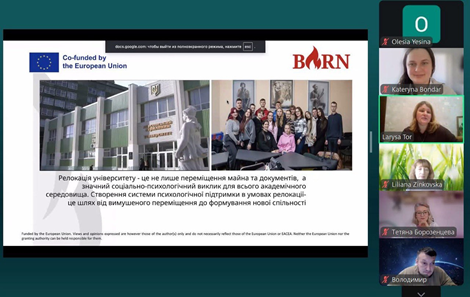 During the webinar, representatives of the Department of Psychology of KSU, Maria Pocheketa and Tyor Larisa, presented the experience of creating a system of psychological support for the university community in conditions of relocation. In particular, it was about the activities of the Center for Psychological Stability and Well-Being, which combines individual consultations, trainings, group meetings, and community-building activities.Such initiatives help maintain psychological resilience, build trust and maintain a sense of community even in the difficult conditions of war and forced displacement.Work experience shows that the psychological stability of the university is not only endurance, but primarily the connection between people, which we maintain even in the most difficult conditions.The webinar was held as part of the Erasmus+ BURN international project ("Boosting University Psychological Resilience and Wellbeing in (Post-) War Ukrainian Nation").