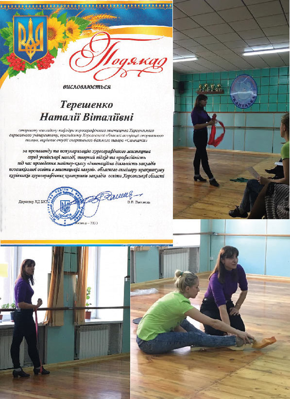 19 лютого 2020 року відбувся обласний семінар-практикум для керівників хореографічних колективів закладів освіти Херсонської області в якому приймала участь старший викладач кафедри хореографічного мистецтва Терешенко Наталя Віталіївна, яка провела лекцію «Інноваційна діяльність закладів позашкільної освіти в мистецькій галузі».