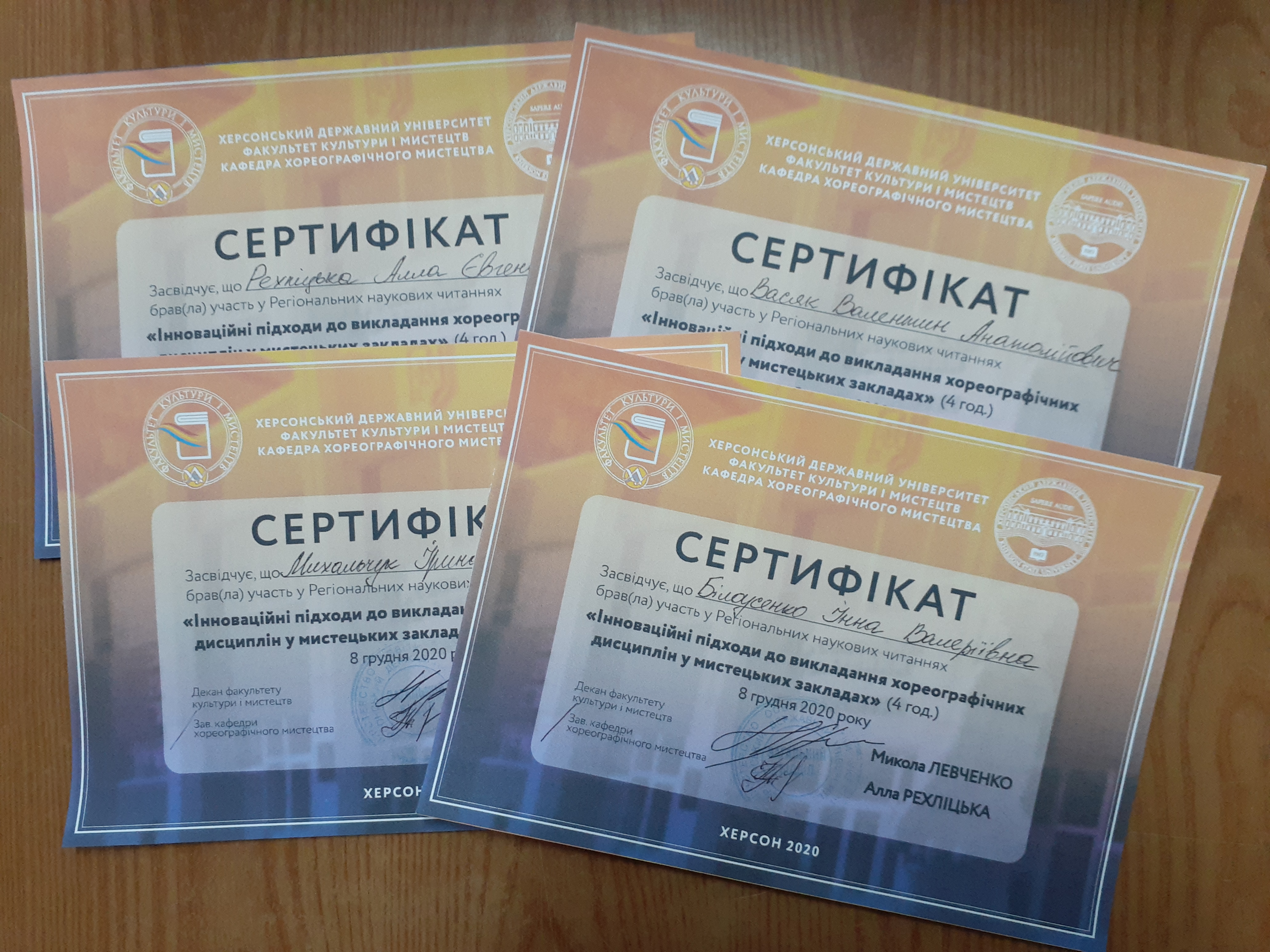 8 грудня 2020 року кафедрою хореографічного мистецтва факультету культури і мистецтв Херсонського державного університету було проведено Регіональні наукові читання «Інноваційні підходи до викладання хореографічних дисциплін у мистецьких закладах», в якому взяли участь професорсько-викладацький склад кафедри, викладачі Херсонського фахового коледжу культури і мистецтв та вчителя хореографічних дисциплін хореографічного відділення Херсонського Таврійського ліцею мистецтв. Були висвітлені теми: «Використання спеціальних тренажерів для розвитку хореографічних здібностей танцівників» – зам. декана з навчально-методичної роботи та практик, кандидаткою педагогічних наук, старшою викладачкою кафедри хореографічного мистецтва Наталею Терешенко, «Інноваційні методи у партерній гімнастиці» – викладачем класичного танцю Херсонського фахового коледжу культури і мистецтв Іриною Циганій, «Специфіка використання імпровізаційних структур у постановчій діяльності керівника хореографічного колективу» – головою циклової комісії «Сучасна хореографія» Херсонського фахового коледжу культури і мистецтв Лесею Макогон, викладачкою сучасного танцю Херсонського фахового коледжу культури і мистецтв Тамілою Котковою, «Взаємовплив традиційних та інноваційних методів навчання у викладанні навчальної дисципліни «Сценічна практика» – викладачем хореографічних дисциплін Херсонського фахового коледжу культури і мистецтв Дмитром Шакулою.