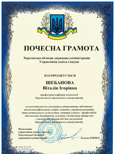Вітаємо доктора психологічних наук, професора, професора кафедри психології Херсонського державного університету Шебанову Віталію Ігорівну із нагородженням почесною грамотою Херсонської обласної державної адміністрації Управління освіти та науки за вагомий внесок у розвиток університету, підготовку висококваліфікованих кадрів, активне сприяння розвитку інтелектуального суспільства, видатні успіхи у професійній діяльності, багаторічну сумлінну працю та з нагоди 104 річниці від дня заснування Херсонського державного університету!!!