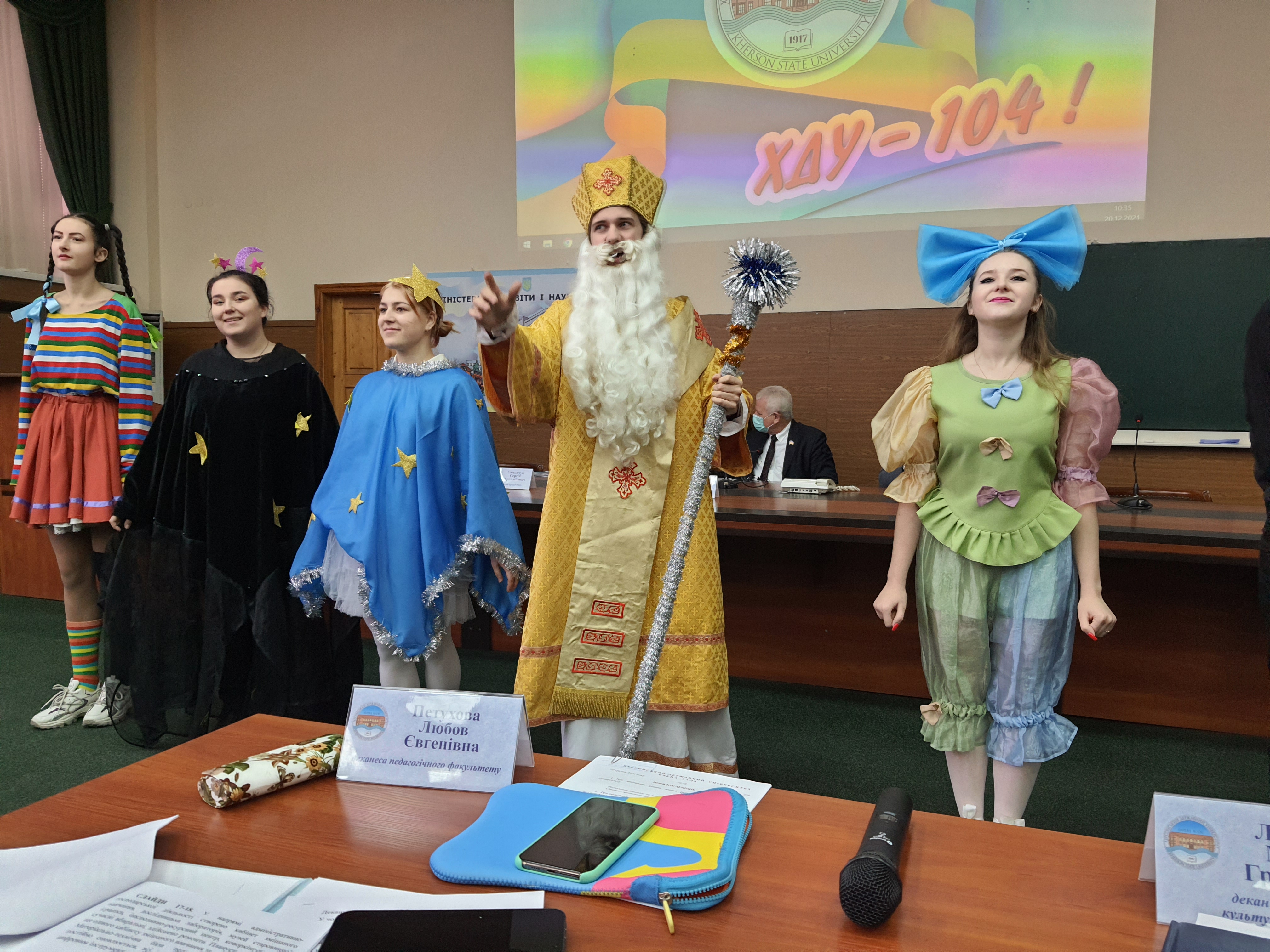 On December 20, 2021, participants of the Student National Theater of KSU "Study-Art" and graduates of the first and third years of the specialty "Culturology" of the Faculty of Culture and Arts under the leadership of Honored Worker of Culture of Ukraine, Professor Lydia Lymarenko congratulated members of the Academic Council of Kherson State University Nicholas and the coming New Year.