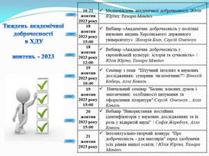16 по 22 жовтня у Херсонському державному університеті проходитиме Тиждень академічної доброчесності. У ці дні студенти, викладачі та співробітники нашого освітнього закладу матимуть можливість долучитися до низки цікавих вебінарів та семінарів.