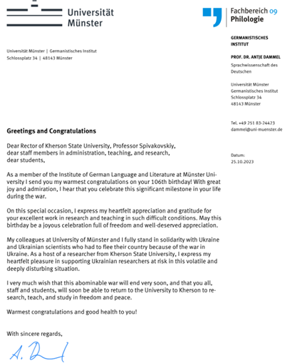 Як співробітник Інституту німецької мови та Мюнстерського університету, я надсилаю вам свої найтепліші вітання з 106-м днем народження! З великою радістю та захопленням я чую, що ви святкуєте цю знаменну віху у своєму житті під час війни.