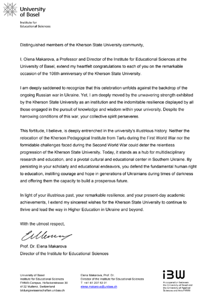 Я, Олена Макарова, професорка, директорка Інституту педагогічних наук Базельського університету, передаю мої щирі вітання кожному з вас із чудовою подією – 106-річчям Херсонського державного університету.