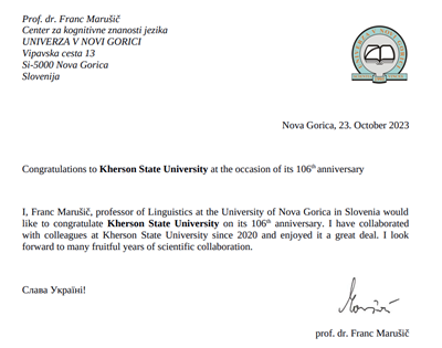 "Я – Франц Марушич, професор лінгвістики Університету Нової Гориці в Словенії, хотів би привітати Херсонський державний університет з 106-ю річницею. Я співпрацюю з колегами в Херсонському державному університеті з 2020 року і отримую від цього величезне задоволення. Сподіваюся на багато плідних років наукової співпраці.