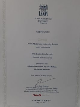 З 11 по 21 травня доцентка кафедри української і слов’янської філології та журналістики Херсонського державного університету Лідія Бондаренко взяла участь у Міжнародному науково-дослідницькому виїзді на Балкани: Греція та Македонія (“Scientific and research trip to the Balkans: Greece and Macedonia”).