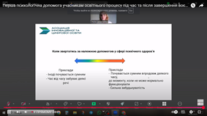 Практичний тренінг «Перша психологічна допомога під час та після війни» щодо техніки визначення психологічного стану дітей за всесвітньо відомою методикою «Save the children», що підтверджена як в Україні, так і у світі був проведений Юлією Загарницькою, психологинею, консультанткою з психічного здоров'я та психосоціальної підтримки, тренеркою міжнародної короткосесійсної програми СЕТА (Інститут Джона Хопкінса, провідний навчальний заклад США у сфері клінічної психології), експерткою програми «Профілактика суїцидів у громадах» (проєкт у співпраці з урядом Норвегії).
