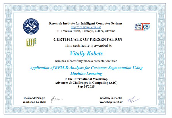На воркшопі, організованому, зокрема, Західноукраїнським національним університетом в місті Тернопіль, професор Кобець Віталій Миколайович представив доповідь з теми: "Application of RFM-D Analysis for Customer Segmentation Using Machine Learning".